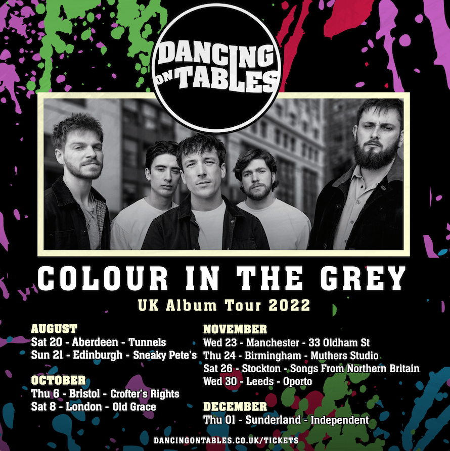 Scottish band Dancing On Tables release a new single ‘How Do I Get Back To Her’. If you like your guitar pop tunes with a good dollop of fun thrown in then this will be for you. There’s an album on the way too. It’s called ‘Colour In The Gray’ and it’s out on October 14th. There’s gigs too, details below