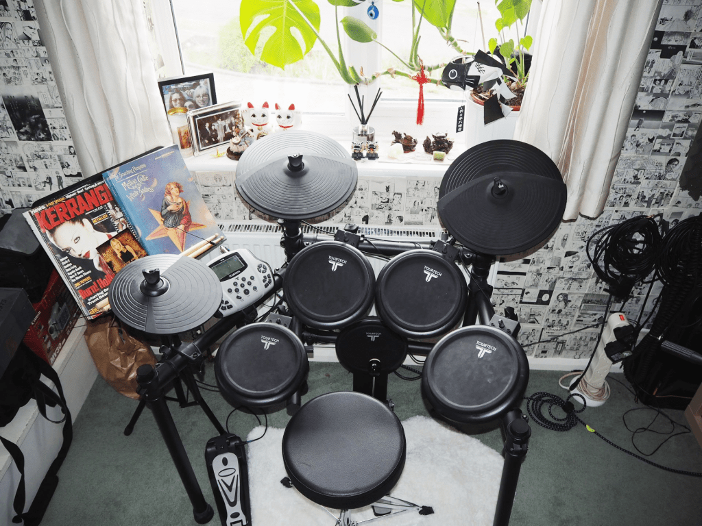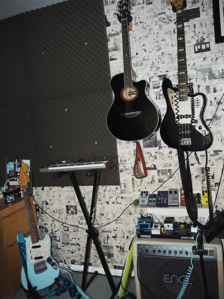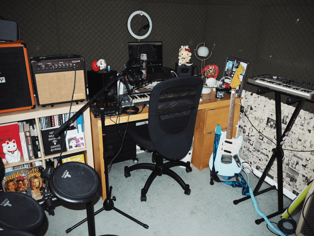 I’m in my cozy home studio, surrounded by electronic equipment, guitars, and an assortment of quirky, ironic knick-knacks.