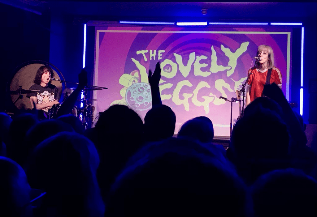 It’s always a good night out with the Lovely Eggs, from the minute the gig starts Holly wants the crowd dancing not just watching. The room the gig itself was in was packed. The first numbers were songs from the new album, which were well received by the crowd, there has been much said about the production on ‘ Eggsistentialism’ by Grammy award winning Dave Fridmann- I’ve got to say I agree it is one of their best yet.. Holly was her usual bundle of energy guitar, in the air, headbanging, then it was back to the old favourites- ‘Magic Onion’ and Wiggy Giggy’ got the crowd bouncing, travellers tales from the night before in Edinburgh moved into the anthemic ‘Fuck it’ the crowd singing along. I think we all would have liked to see the German family whose room David failed to break into in the room as we sympathised with the demise of David’s fridge!
